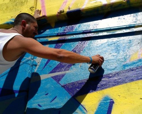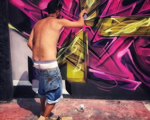Il suo percorso inizia con le scritte, sviluppa una tecnica completa: sfumature, linee, geometrie con una vasta quantità di prodotti che vanno oltre anche all’utilizzo dello spray.
